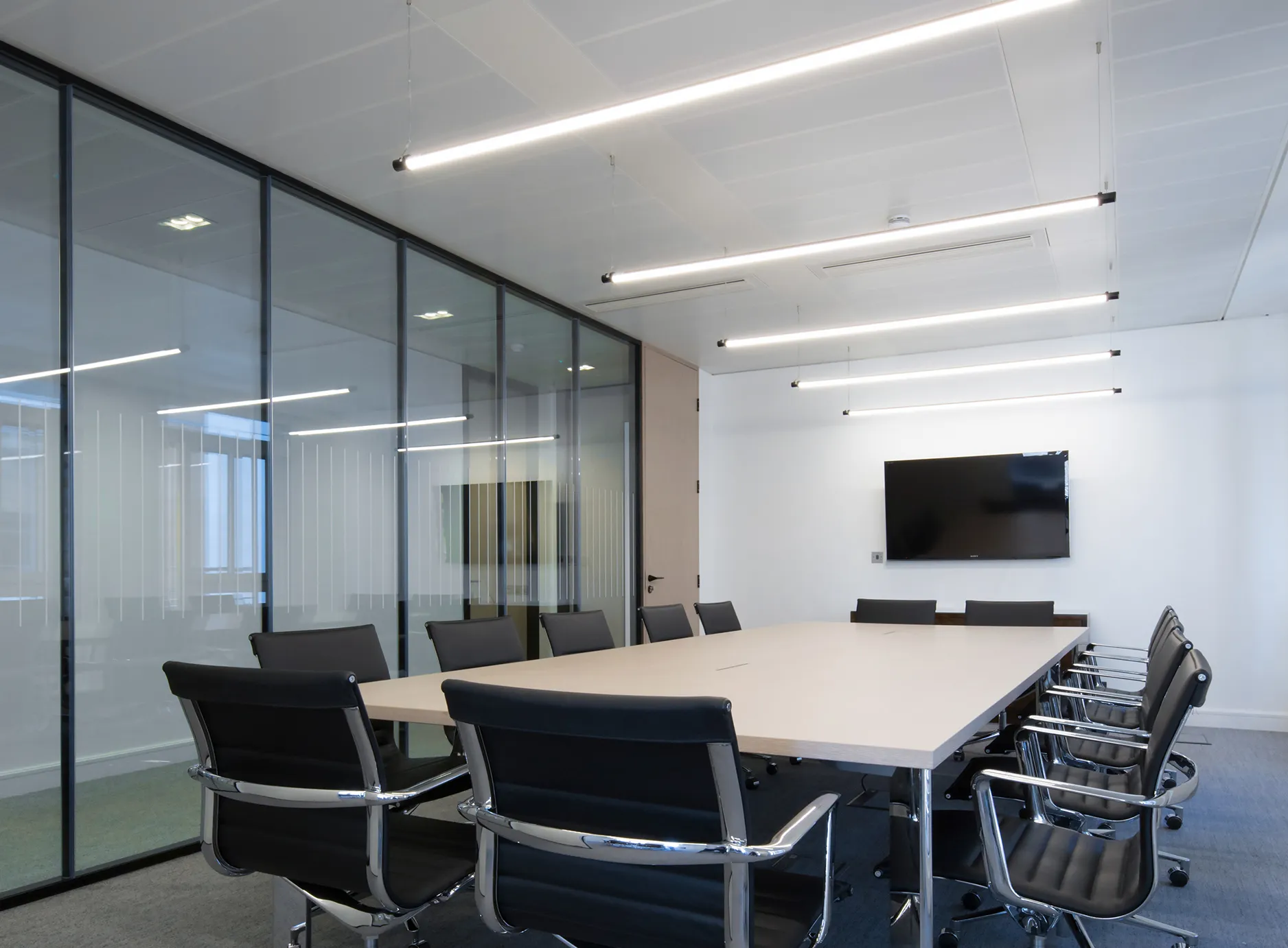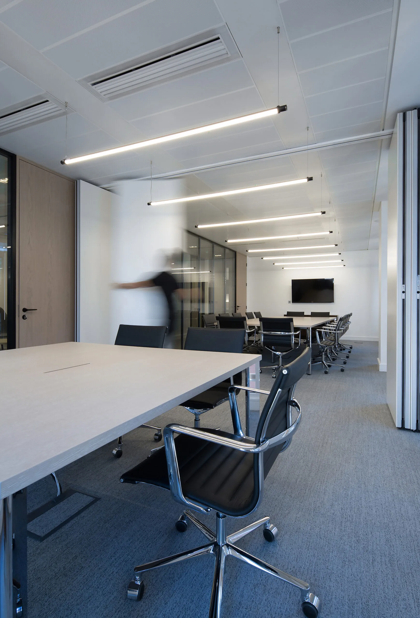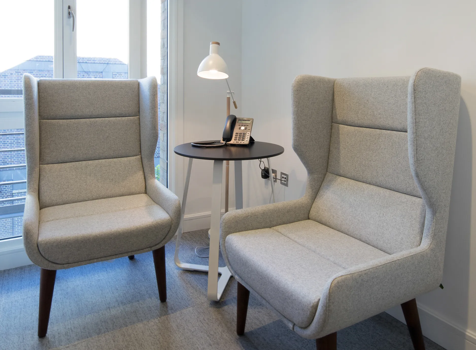 The small meeting rooms, complete with movable acoustic panels, are perfect for confidential client meetings, whilst the communal areas feel open, light and spacious. The use of oak timber and felt surfaces create a warm atmosphere in a professional context.