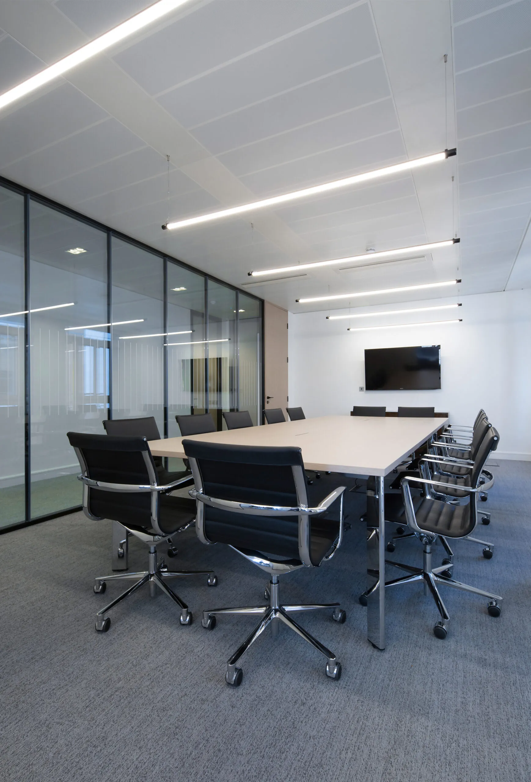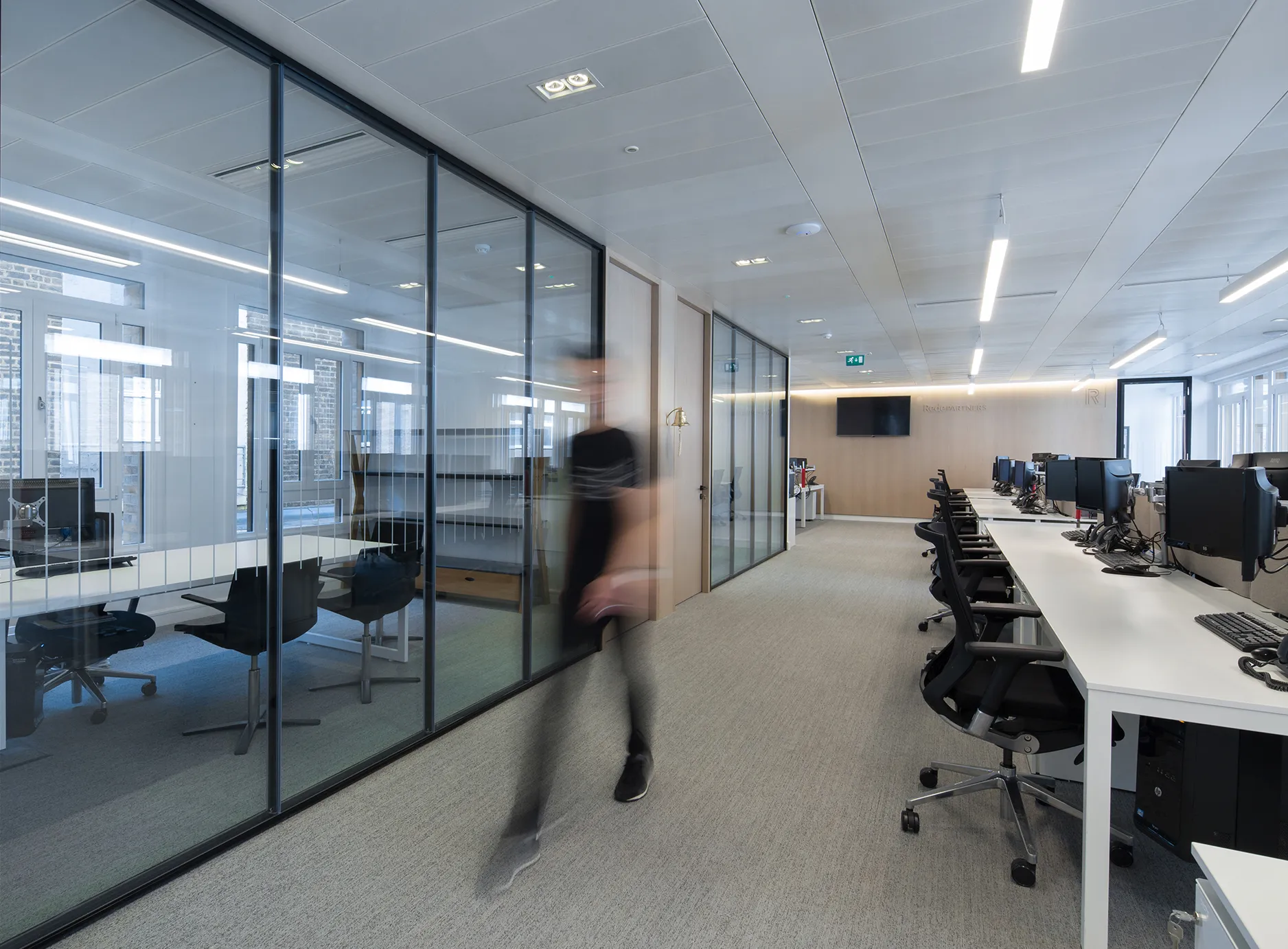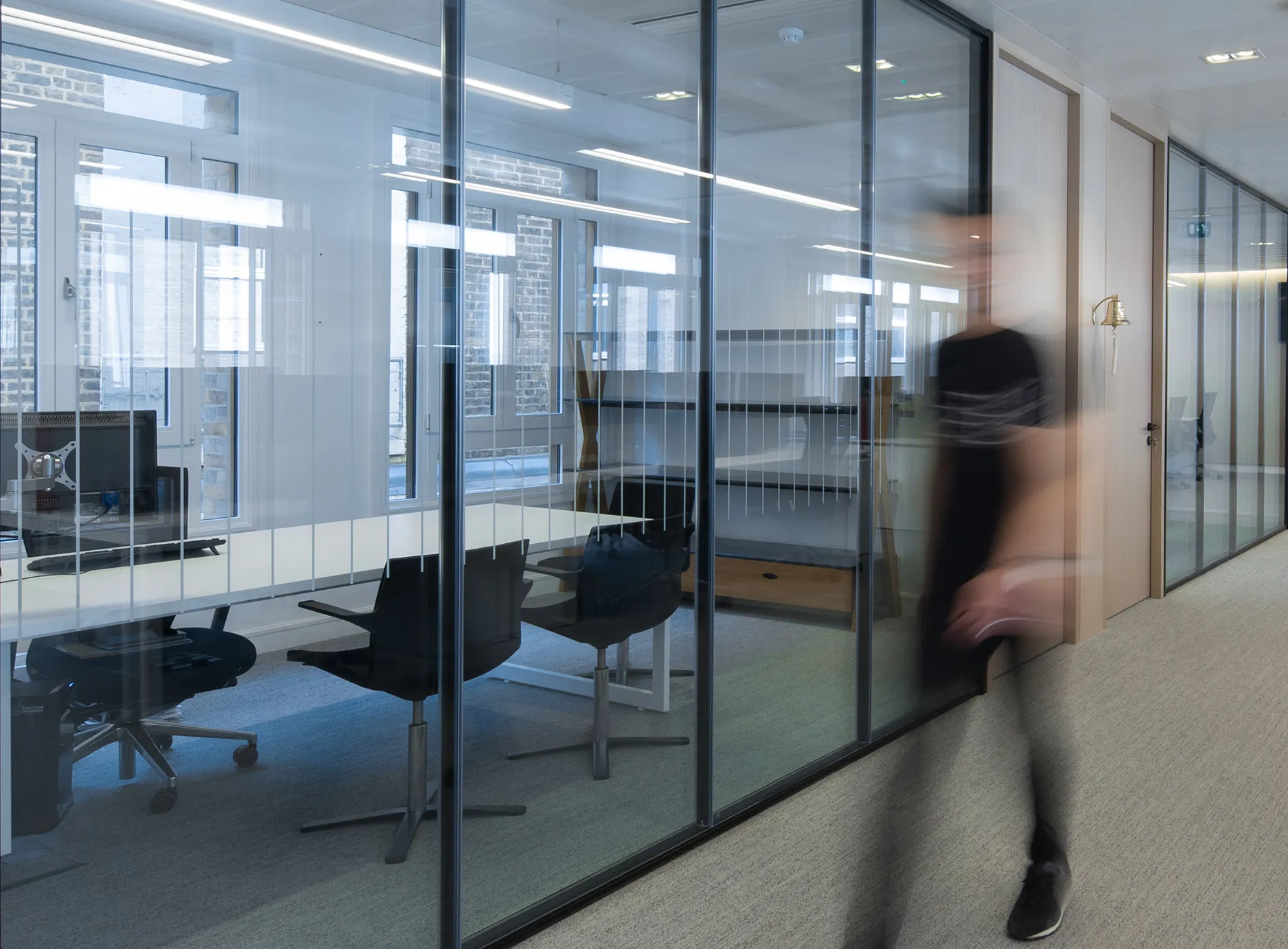 The small meeting rooms, complete with movable acoustic panels, are perfect for confidential client meetings, whilst the communal areas feel open, light and spacious. The use of oak timber and felt surfaces create a warm atmosphere in a professional context.